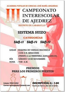 La Academia Popular de Ciencias "José María Arguedas" informa a todo el público, y en especial a los estudiantes de educación Primaria y Secundaria de Carabayllo, que el día 14 de noviembre se llevará a cabo el III Campeonato Interescolar de Ajedrez.